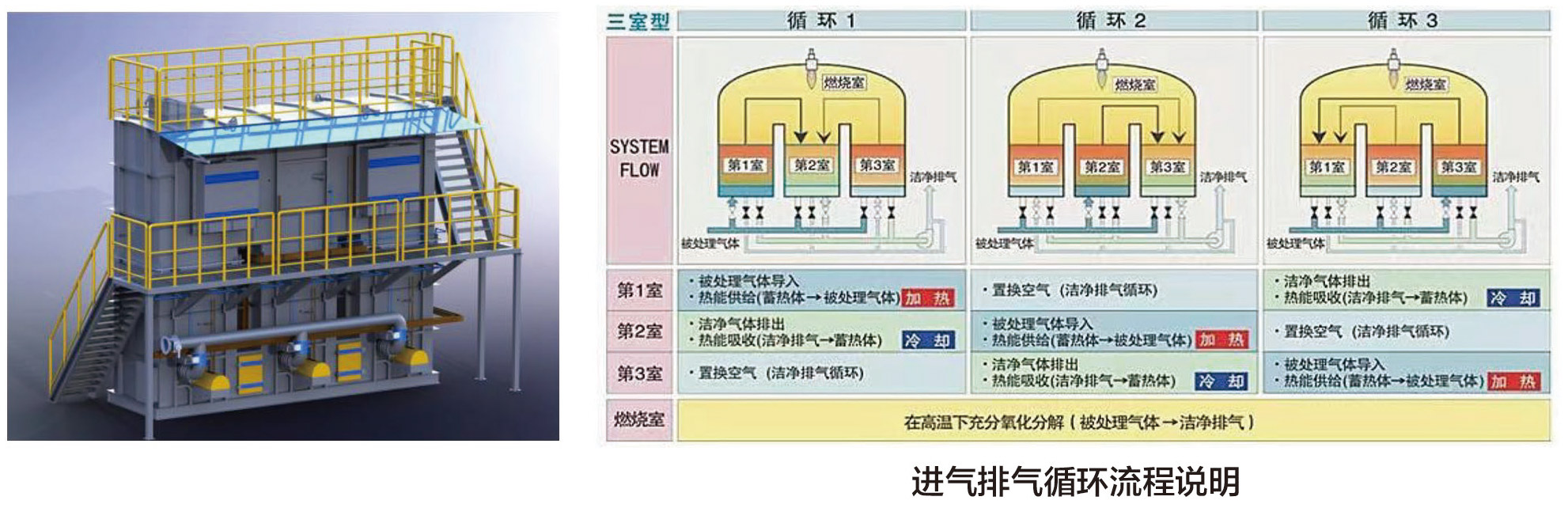 環(huán)中已被冷卻),放熱降溫后排出,而蓄熱室2吸收大量熱量后升溫(用于下一個循環(huán)加熱廢氣)。凈化后的廢氣經(jīng)煙囪排入大氣,同時引小股凈化氣清掃蓄熱室3。排氣溫度比進氣溫度高約40℃左右。