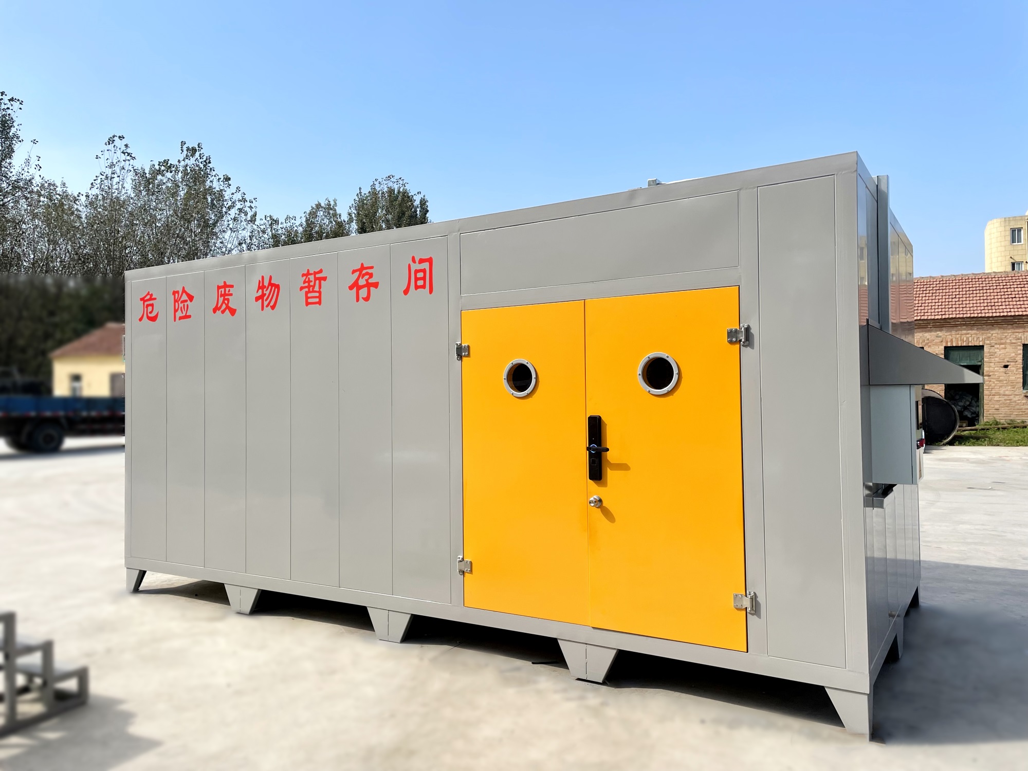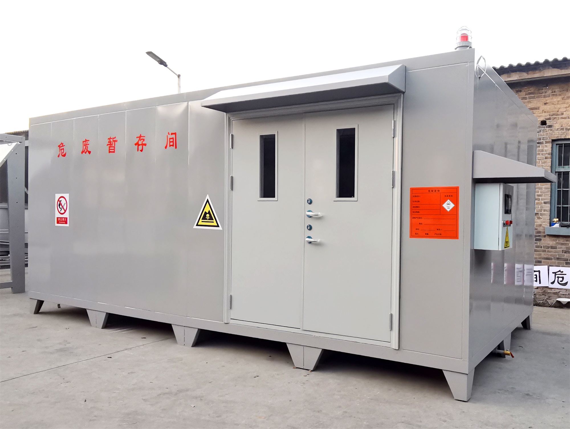 ?。?)不相容的危險廢物必/須分開存放,并設(shè)有隔離間隔斷。目前,工業(yè)企業(yè)大部分都還是使用企業(yè)內(nèi)部的普通房間(或是車間內(nèi)隔開的區(qū)域)來作為危廢暫存場地,場地基本無做防護處理,且大多數(shù)企業(yè)的危廢均無密封包裝,成為廠區(qū)的廢氣無組織擴散源。且企業(yè)現(xiàn)有的危廢暫存間不具備防火、防腐蝕等功能,如果稍有不慎,那些瓶裝、罐裝的易燃的氣體、液體就會發(fā)生傾倒、泄漏,易釀成泄毒、火災(zāi)、爆炸等事故,后果不堪設(shè)想,因此急需設(shè)計一種專用的工業(yè)企業(yè)危險廢棄物暫貯存或暫貯存的箱式可移動危廢倉庫。